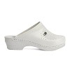 Ženska klompa izrađena od ekološke kože sa ventilirajućim rupicama i kožnom tabanicom koja sadrži masažni gel. Đon je naparvljen od poliuretanske mase..