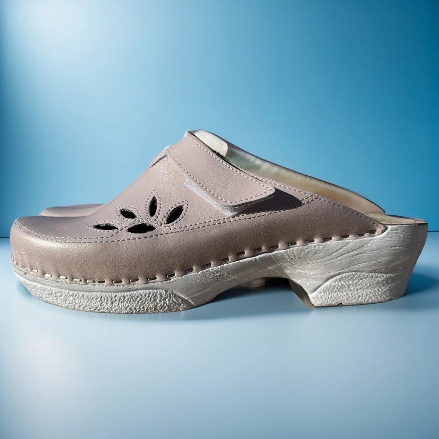 Mekana tabanica od velur-kože daje prijatan osećaj stopalima, dok anatomski oblikovan đon obezbeđuje prirodnu potporu, čineći klompu udobnom čak i nakon dužeg nošenja.