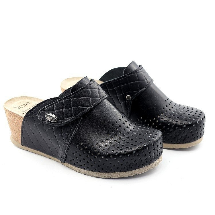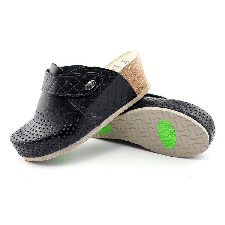 Odgovaraju svakom obliku noge. Klompe na visokoj potpetici izrađene su od prave goveđe kože sa đonom od 100% prirodne plute, osiguravajući dugotrajnost i kvalitet. Anatomski oblikovan đon sa antiklizačima pružiće sigurnu potporu pri hodu u obavljanju svakodnevnih kućnih poslova.