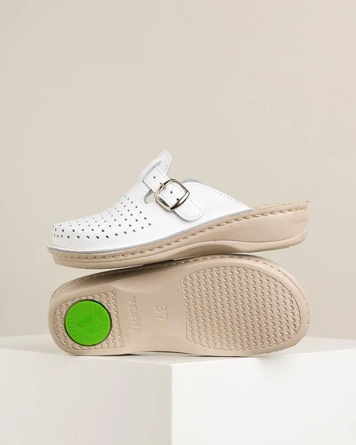 Ženska klompa izrađena od najfinije prirodne kože, sa kožnom tabanicom koja sadrži 8 mm masažnog gela, pruža izuzetnu udobnost i rasterećenje pri svakom koraku. Masažni gel apsorbuje udarce, smanjuje pritisak na pete i idealan je izbor za osobe koje imaju problem petnog trna, kao i za sve koji provode mnogo vremena stojeći ili hodajući.